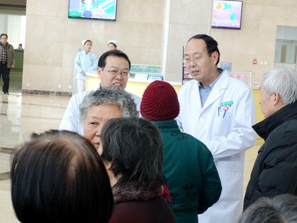 我院院長王德、書記陸武京、副院長張振立、李偉、寧來軒首先代表全院職工對各位老領(lǐng)導(dǎo)、老師和同仁的到來表示歡迎,肯定了他們在過去不同時(shí)期為醫(yī)院的建設(shè)與發(fā)展所做出的貢獻(xiàn)。王院長向各位離退休職工詳細(xì)介紹了我院近幾年的發(fā)展?fàn)顩r、醫(yī)院特色、新院大樓內(nèi)部的布局、大樓運(yùn)行后的具體情況、改擴(kuò)建工程二期建設(shè)項(xiàng)目以及對外合作項(xiàng)目、醫(yī)院未來的發(fā)展目標(biāo)等情況。趙錦西等醫(yī)院老領(lǐng)導(dǎo)對醫(yī)院長期以來的關(guān)心愛護(hù)表示感謝,對醫(yī)院的建設(shè)與發(fā)展提出了合理化建議。