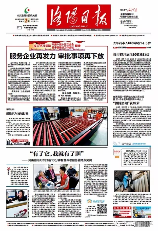 今年,1月28日,新華社播發(fā)通訊《有了它,我就有了膽》,并同步播發(fā)一組圖片,報(bào)道我院與洛陽市居家養(yǎng)老服務(wù)中心聯(lián)合搶救澗西區(qū)全盛盈老人的事兒。同時對我市著力推動養(yǎng)老服務(wù)理念、方式、技能創(chuàng)新,打造10分鐘智慧養(yǎng)老服務(wù)圈,形成“互聯(lián)網(wǎng)+照護(hù)服務(wù)”“互聯(lián)網(wǎng)+移動醫(yī)療”“互聯(lián)網(wǎng)+老年金融”等特色智慧養(yǎng)老服務(wù)的做法進(jìn)行了報(bào)道!吨袊W(wǎng).新聞中心》、《環(huán)球網(wǎng)》、《貴陽網(wǎng)》、《洛陽日報(bào)》、《洛陽晚報(bào)》等十余家國內(nèi)主流媒體進(jìn)行了轉(zhuǎn)發(fā),其中《洛陽日報(bào)》在1月29日頭版位置進(jìn)行了全文刊發(fā),全文如下: