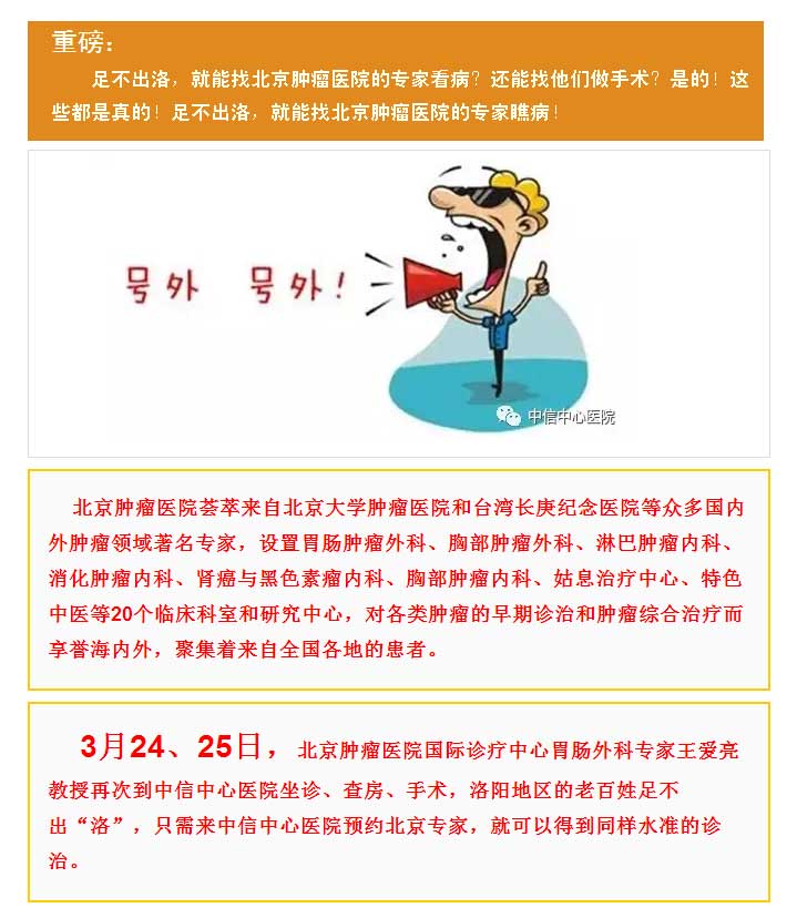 3月24日、25日,北京腫瘤醫(yī)院國際診療中心胃腸外科專家王愛亮教授坐診中信中心醫(yī)院,快快約起吧!