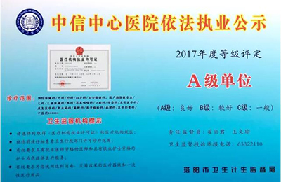 按照河南省衛(wèi)計委“關(guān)于實施醫(yī)療機構(gòu)衛(wèi)生監(jiān)督量化分級管理制度的通知”要求,洛陽市衛(wèi)生計生監(jiān)督局依據(jù)國家有關(guān)法律法規(guī),對各醫(yī)療機構(gòu)依法執(zhí)業(yè)中的執(zhí)業(yè)資質(zhì)、人員資質(zhì)、傳染病防治、血液安全、放射診療和防護等相關(guān)內(nèi)容進行了相應(yīng)頻次的現(xiàn)場檢查和量化評分,并結(jié)合省、市衛(wèi)計委統(tǒng)一部署的專項檢查和暗訪結(jié)果,評定出2017年度醫(yī)療機構(gòu)依法執(zhí)業(yè)等級,其中依法執(zhí)業(yè)量化分級A級單位19家,中信中心醫(yī)院名列其中。此外還評定出依法執(zhí)業(yè)量化分級B級單位13家、依法執(zhí)業(yè)量化分級C級單位2家等。