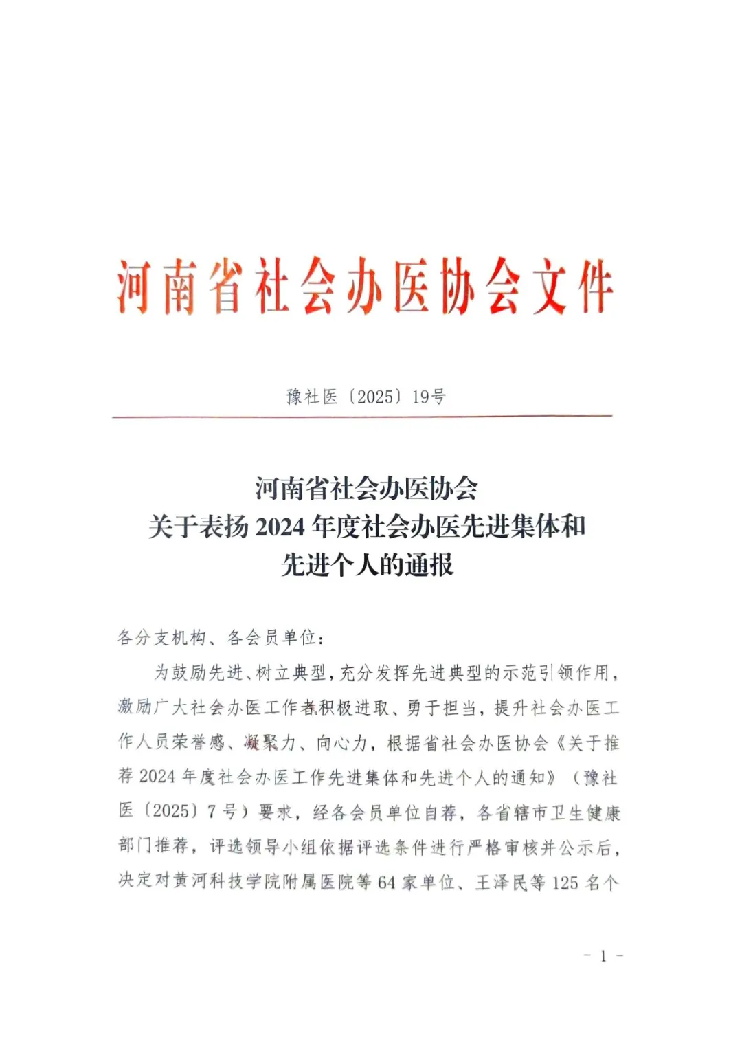 在河南省社會辦醫(yī)協(xié)會組織的2024年度社會辦醫(yī)工作先進集體和先進個人評選中,我院以扎實的工作成效和積極的行業(yè)貢獻,被授予“先進集體”榮譽稱號;院長賀向無榮膺“先進個人”稱號。